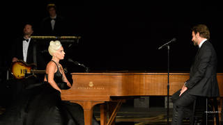 Lady Gaga at the Oscars ceremony on a walnut Steinway grand piano